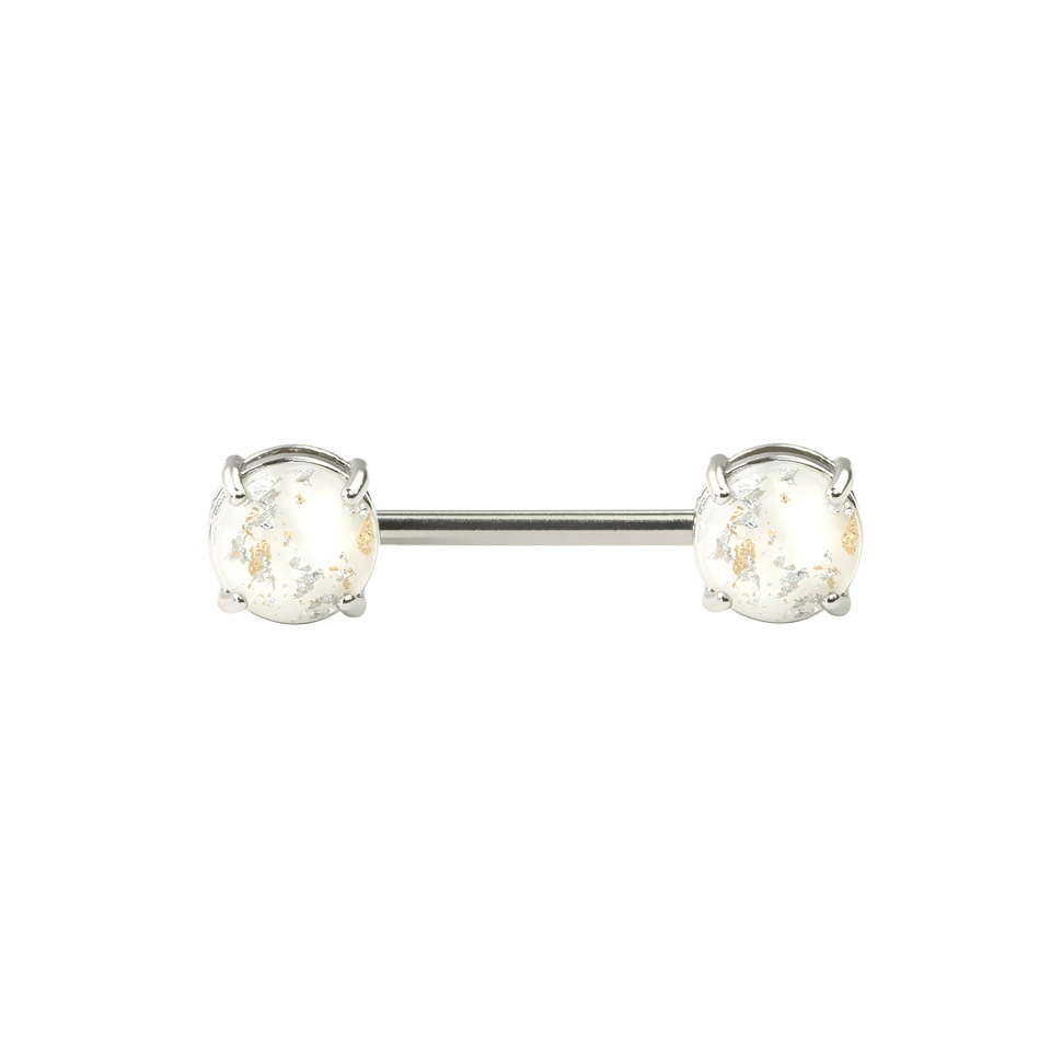 Voici un piercing pour le mamelon avec deux pierres aux extrémités tenues par 4 petites dents. Ces pierres rappellent la lave d'un volcan, mais sans mouvements aléatoires. Les pierres sont en résine, ce qui leur donne ce look. C'est pourquoi ils réalisent également un jeu de couleurs incroyablement agréable, car ils contiennent en même temps d'autres tons que le principal choisi pour les pierres.