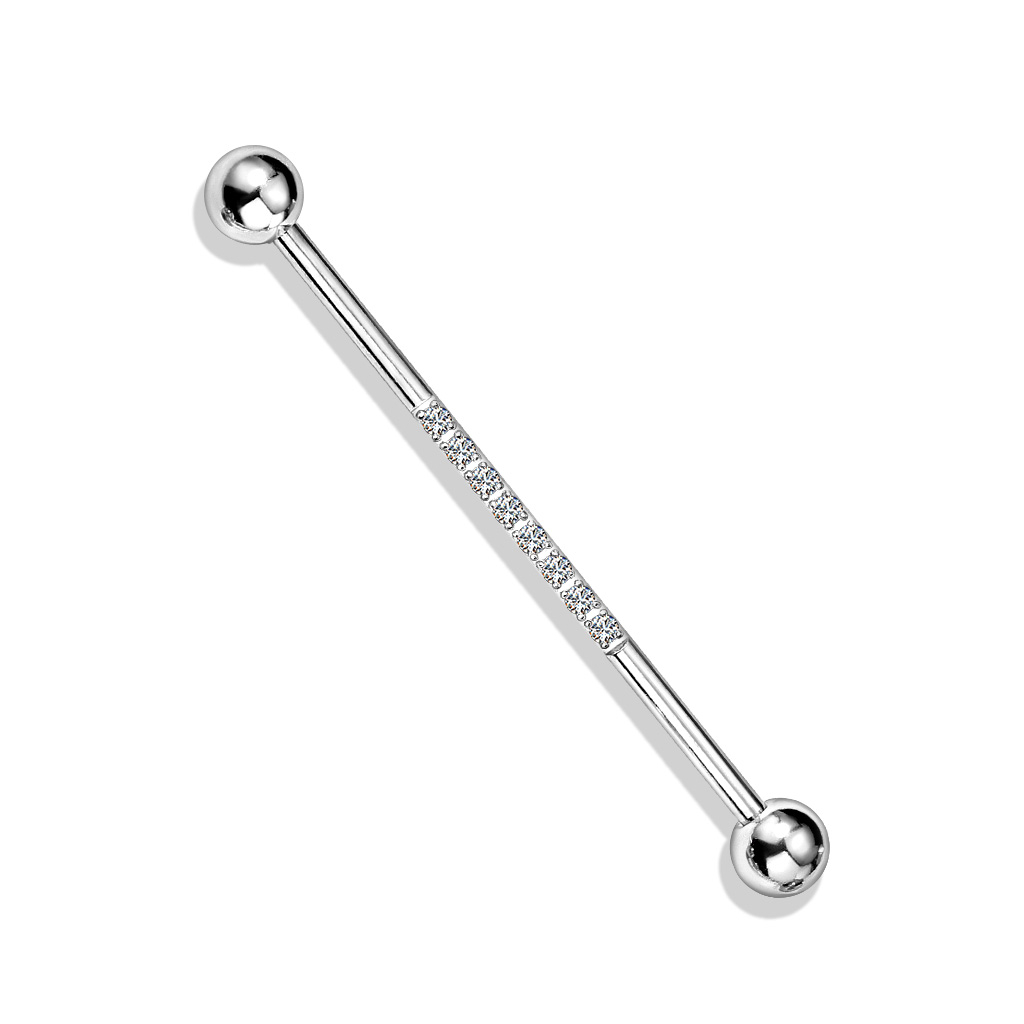 Si tu cherches un piercing pour l'oreille industriel, nous avons un beau bijou pour toi. Ce bijou est constitué d'une tige droite, comme tu le sais, avec deux boules, une à chaque extrémité. Au centre de la tige est creusée une petite encoche où 8 petites pierres sont placées avec une précision à la limite de la perfection. La tige en acier chirurgical est disponible en différentes couleurs, tout comme les pierres. Cependant, seule la version en argent poli peut être choisie avec des pierres de couleur. En d'autres termes : les tiges de couleur ne peuvent être sélectionnées qu'avec des pierres de couleur claire. La tige est longue de 38 mm et les billes de 5 mm, tandis que l'épaisseur est de 1,6 mm comme toutes les autres tiges industrielles.