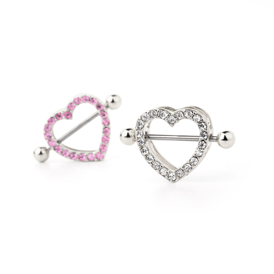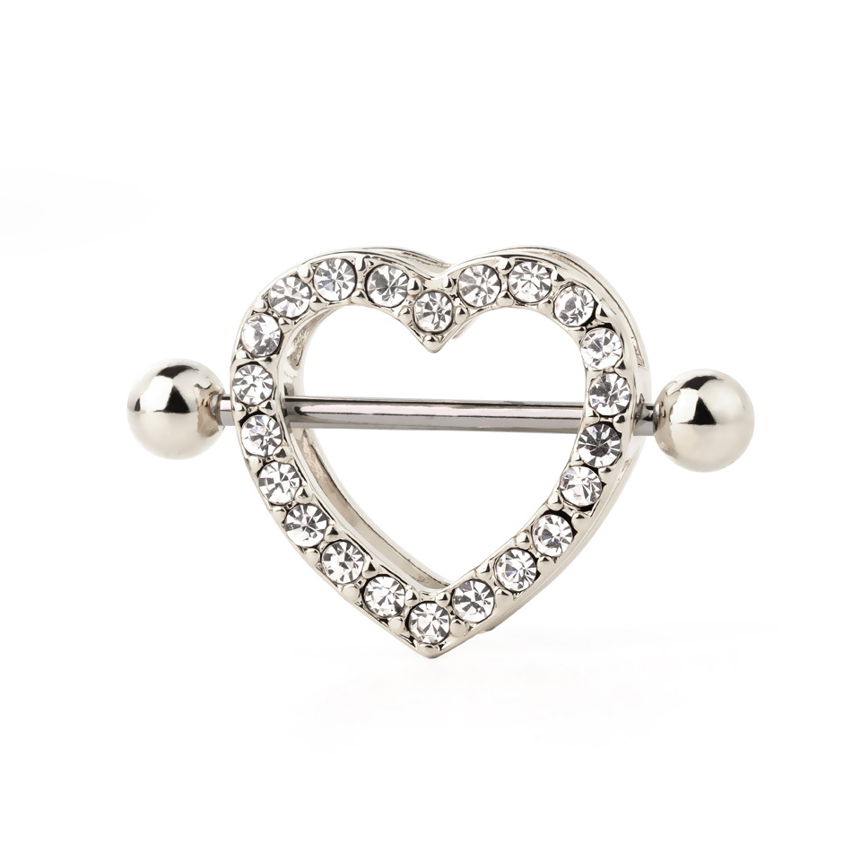 Ce bijou fantastique est parfait si tu as un bon coeur ;-) C'est un bijou pour le piercing au mamelon incroyablement féminin, avec deux larges profils en forme de cœur, dont l'un est plein de petits diamants en forme de diamants. Les deux coeurs sont montés l'un sur l'autre à l'exception d'une petite distance, celle de la barre qui perce le piercing. Ce bijou donnera un look super sexy à ton mamelon, encore plus qu’il ne l’est déjà.