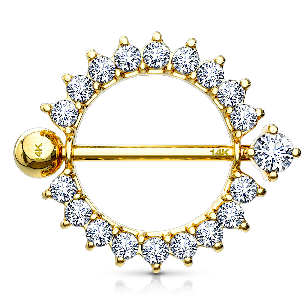 Tu recherches un bijou exclusif pour ton piercing au mamelon ? Voici un bijou en or pur de 14 carats, avec de belles pierres tout autour. Ce magnifique bijou ressemble à un petit soleil, grâce à ses nombreuses pierres, qui brillent d'une manière incomparable. Chacune des pierres est intégré dans le bijou (non collé).