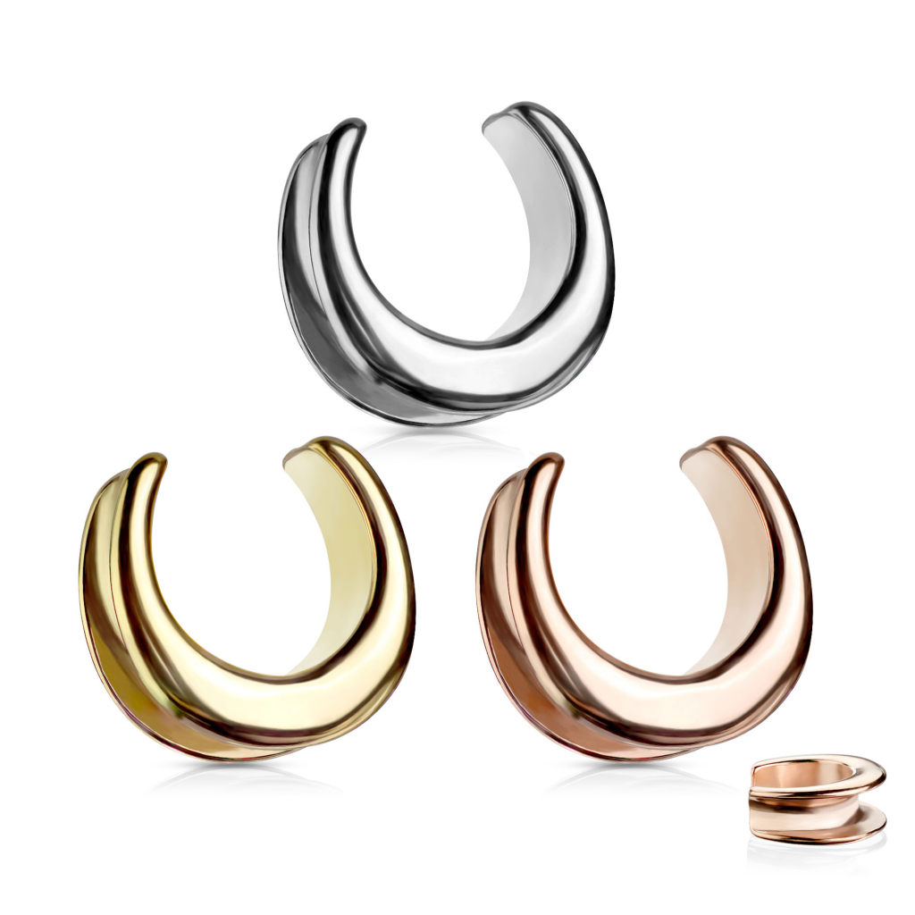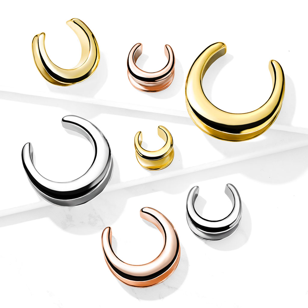 Les bijoux que tu vois ici sont un peu difficiles à classer. Le nom est un écarteur selle et ce n'est ni un tunnel, ni un plug, ni un cintre. Et ce n'est pas un pendentif. Le plus proche est peut-être un tunnel, comme tu peux voir à travers les bijoux. Cependant, les bijoux sont ouverts en haut. L'avantage est que tu peux utiliser les bijoux même si ton trou dans l'oreille est plus grand que le diamètre des bijoux. Les bords des bijoux s'enroulent vers le bas, ce qui les fait encercler le bord de ton trou. Ainsi, il ne tombe pas, même si les bijoux sont plus petits que ton trou.
