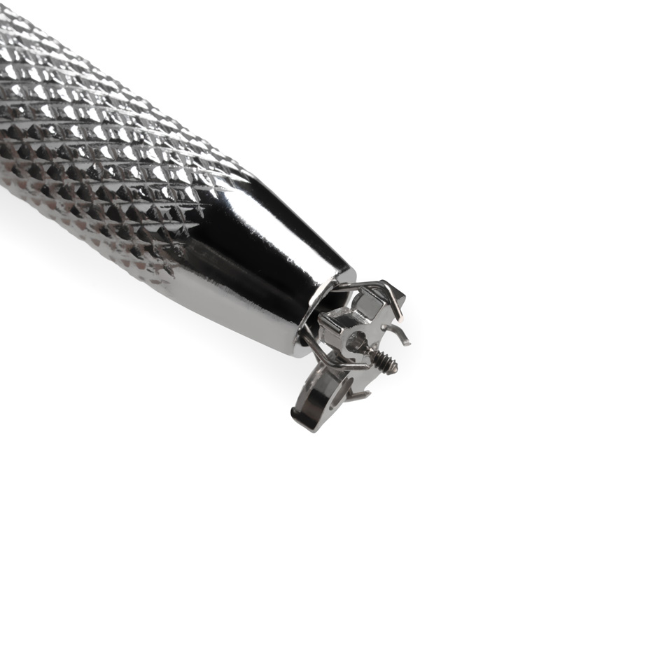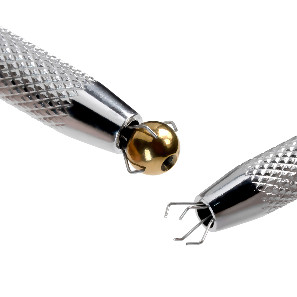 Il est doté de quatre griffes qui s'ouvrent lorsque tu appuies sur l'extrémité, permettant de tenir des boules de 3 à 6 mm et de les visser dans ton barbell, anneau ou ta tige de labret. Assure-toi simplement que le trou ou la vis de la boule est orienté vers l'extérieur, sinon la magie n'opérera pas.