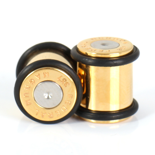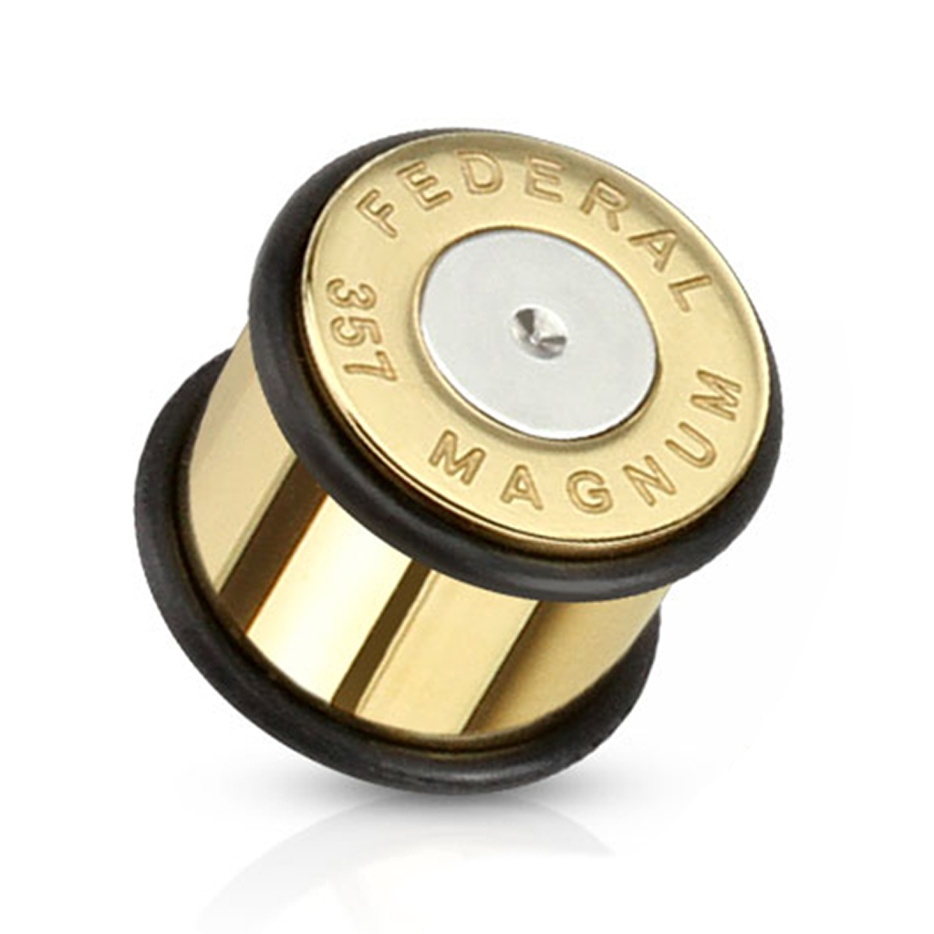 C'est un plug que tu peux porter dans vos étirements. Il a la forme d'une cartouche de balle, Magnum de calibre.357, qui tire des balles de 9 mm. Malheureusement, les plugs, ainsi que les tunnels, sont comptés en nombres pairs. Pour cette raison, ce plug n’a pas la taille exacte des cartouches. Cependant, il est disponible en 6 tailles différentes, de 6 mm à 16 mm.