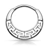 Ce bijou est orné d’un dessin ressemblant à un labyrinthe ou à une frette, qui traverse le bijou d’un bout à l’autre. Le bijou est légèrement plus épais au centre que des deux côtés, ce qui lui confère une harmonie totale.