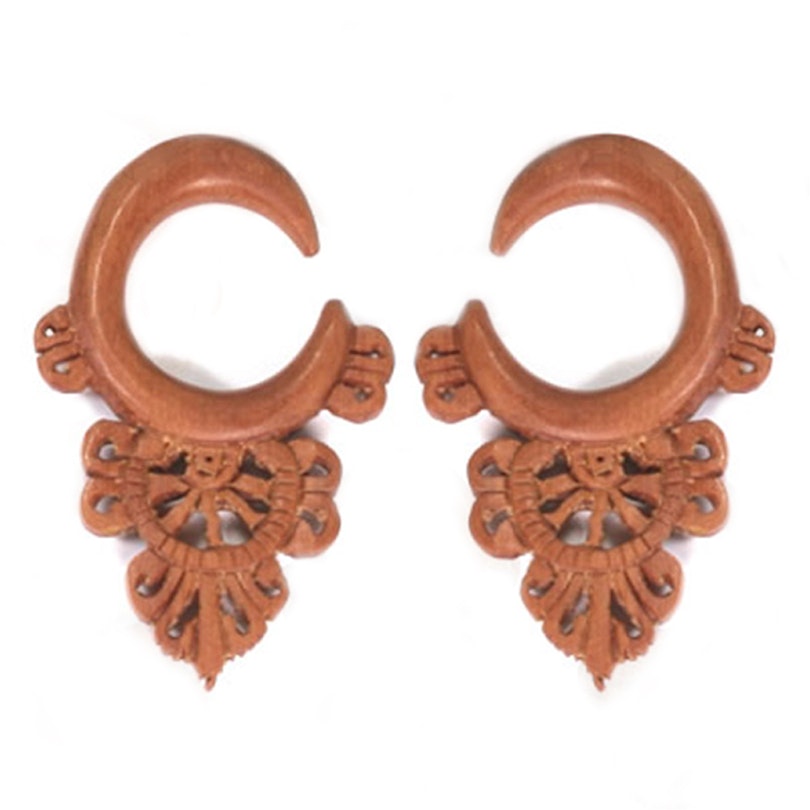 Ce bijou va pendre de vos dilatations; Il est fait de bois de palmier (Sabal Palmetto). Ce type de bois est brun foncé avec des tons rougeâtres et, depuis les anneaux de bois ne sont pas clairement visibles; Il est souvent utilisé dans les bijoux de piercing en raison de sa couleur uniforme.