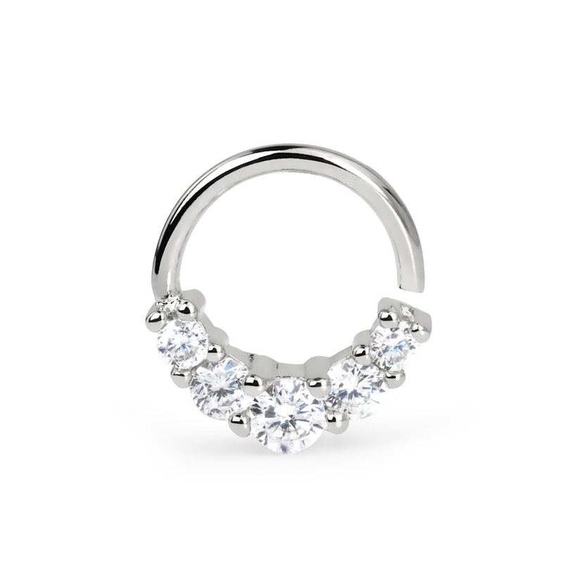 L'anneau peut être utilisée dans plusieurs piercings. Ton imagination et bien sûr la forme et les dimensions des bijoux définissent les limites. Utilises-le, par exemple., dans le septum, dans le daith ou dans d'autres trous où les dimensions le permettent. L'anneau a un diamètre interne de 8 mm. et une épaisseur de fil de 1,2 mm.
