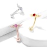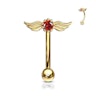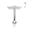 Cette tige courbée est particulièrement adaptée au sourcil. La tige mesure 8 mm. de longueur et 1,2 mm. d'épaisseur. Au bas de la tige, il y a une boule de 3 mm. de diamètre pouvant être vissée. Au sommet de la tige, un ensemble d'ailes d'ange s'étend de chaque côté. Au milieu des ailes, il y a une belle pierre qui, en fonction de ton choix de couleur de matériau, est également différente.