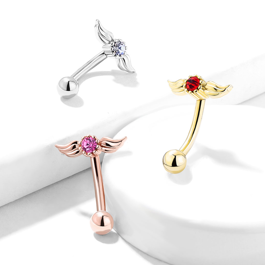 Cette tige courbée est particulièrement adaptée au sourcil. La tige mesure 8 mm. de longueur et 1,2 mm. d'épaisseur. Au bas de la tige, il y a une boule de 3 mm. de diamètre pouvant être vissée. Au sommet de la tige, un ensemble d'ailes d'ange s'étend de chaque côté. Au milieu des ailes, il y a une belle pierre qui, en fonction de ton choix de couleur de matériau, est également différente.