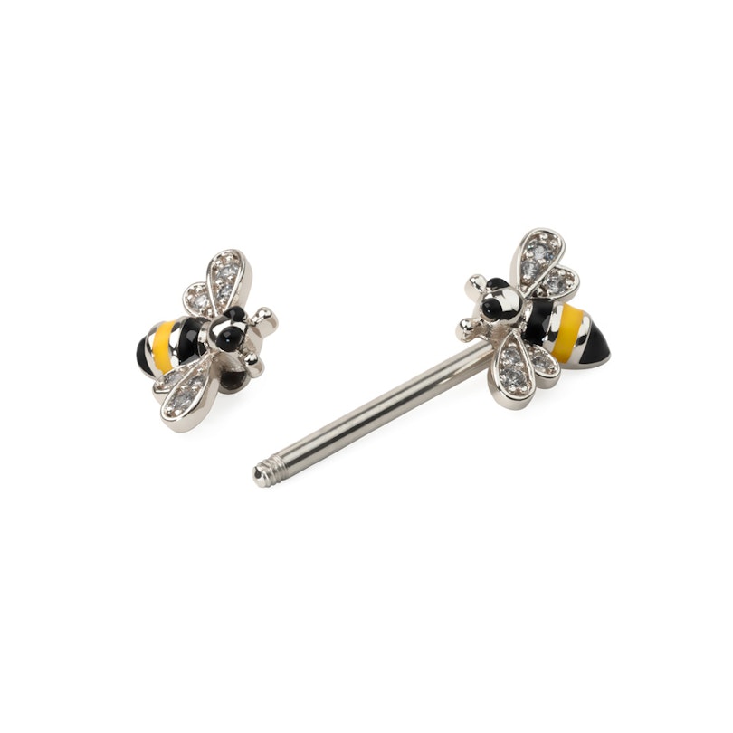 Un bourdon se trouve à chaque extrémité du bijou et ajoute une jolie touche de couleur. Les ailes des bourdons sont ornées de pierres transparentes en zircone, ce qui confère un charme unique à ce bijou. Tu peux choisir la couleur que tu préfères parmi deux couleurs différentes. Le bijou restera le même, quelle que soit la couleur que tu choisis. La tige droite est en acier chirurgical, le matériau le plus courant pour les bijoux de piercing. Les bourdons sont en laiton et ont été revêtus de rhodium ou de PVD.