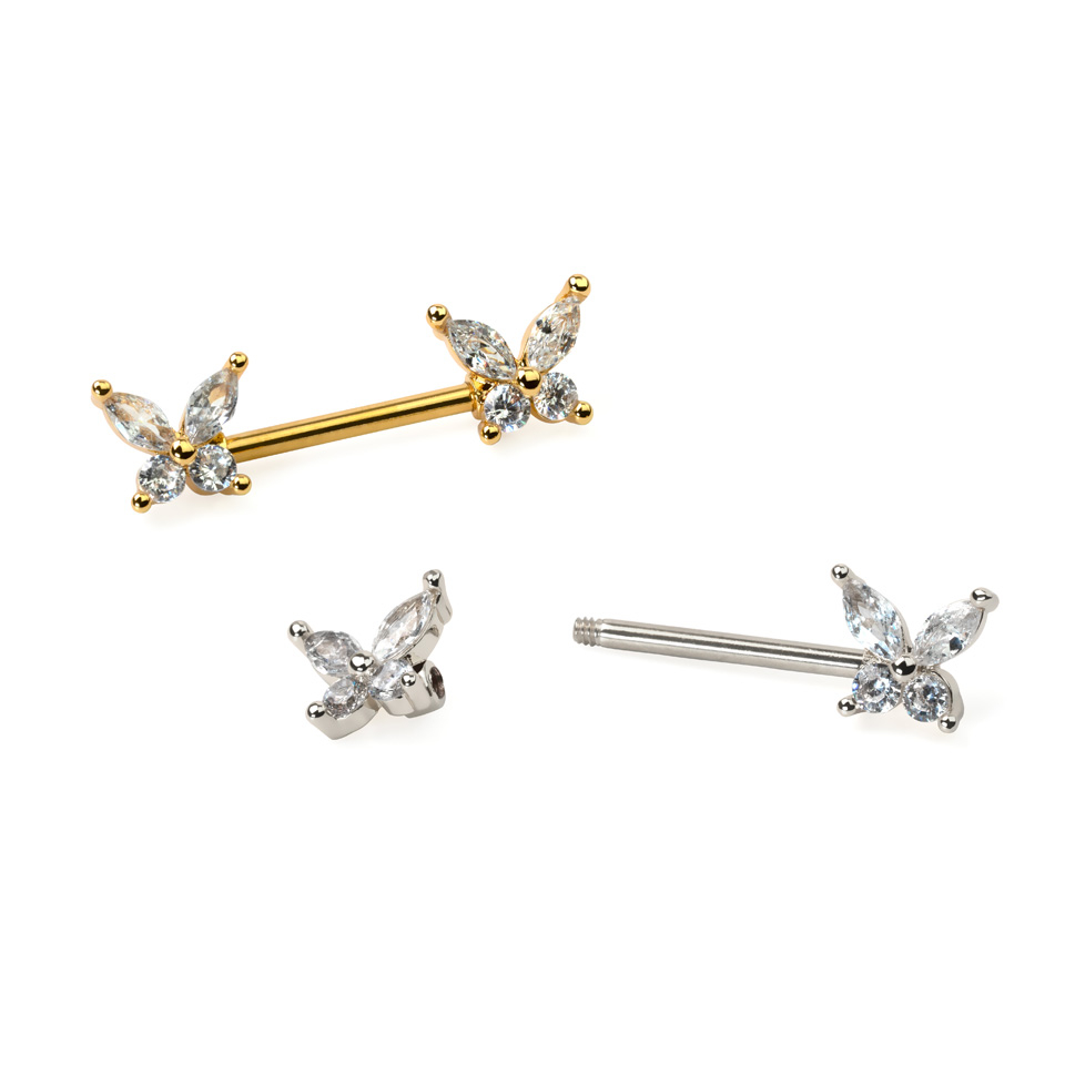 Tu peux choisir la couleur que tu préfères parmi deux options de couleur différentes. Le bijou restera le même, quelle que soit la couleur que tu choisis. La tige droite est en acier chirurgical, le matériau le plus fréquemment utilisé pour les bijoux de piercing. Les papillons sont en laiton et ont été revêtus de rhodium et de PVD.