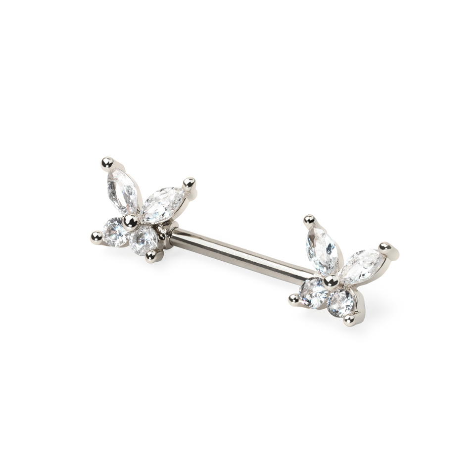 Ce bijou de référence, qui conjugue classe et mode à la perfection, est un bijou que tu te dois d'ajouter à ta collection. Les ailes de chaque papillon sont ornées de pierres en zircone, ce qui confère une touche sophistiquée à ce très joli bijou pour le téton.