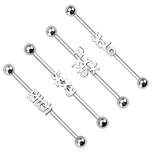 Avec cette tige pour ton piercing industriel, tu peux envoyer un message au monde entier. Fuck Me est le message le plus provocant de tous, Sexy qui montre plus de confiance en soi, Bitch est la plus enjouée, et Yolo, l'acronyme anglais de "You only live once" pour le plus philosophique.
