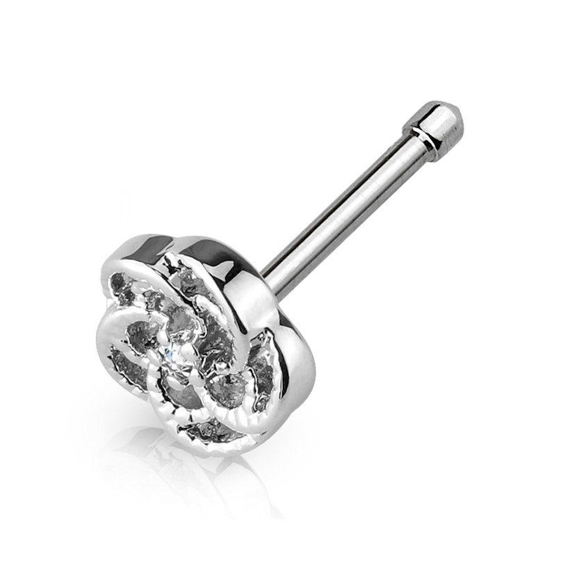 Cette tige de nez douce a une rose délicate. La rose a des trous délicats qui simulent ses pétales, ainsi elle ressemble presque à une sculpture. Au milieu de la rose, il y a un petit brillant de couleur claire, qui se combine parfaitement avec la finition brillante du bijou.