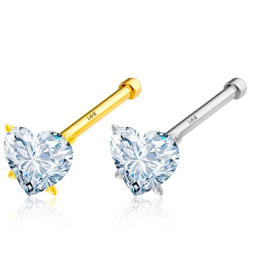 Cette tige de nez est disponible en deux types d'or différents: l'or jaune 14 carats et l'or blanc 14 carats. En plus du matériel, ils sont 100% identiques. Les deux ont une tige d'environ 6 mm de long et 0,8 mm d'épaisseur, au bout de laquelle se trouve un joli coeur en forme de coeur brillant, qui garantit que le bijou ne laisse pas sa place.