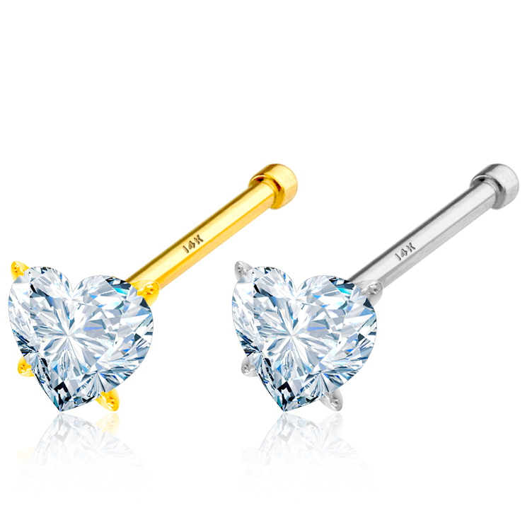 Cette tige de nez est disponible en deux types d'or différents: l'or jaune 14 carats et l'or blanc 14 carats. En plus du matériel, ils sont 100% identiques. Les deux ont une tige d'environ 6 mm de long et 0,8 mm d'épaisseur, au bout de laquelle se trouve un joli coeur en forme de coeur brillant, qui garantit que le bijou ne laisse pas sa place.