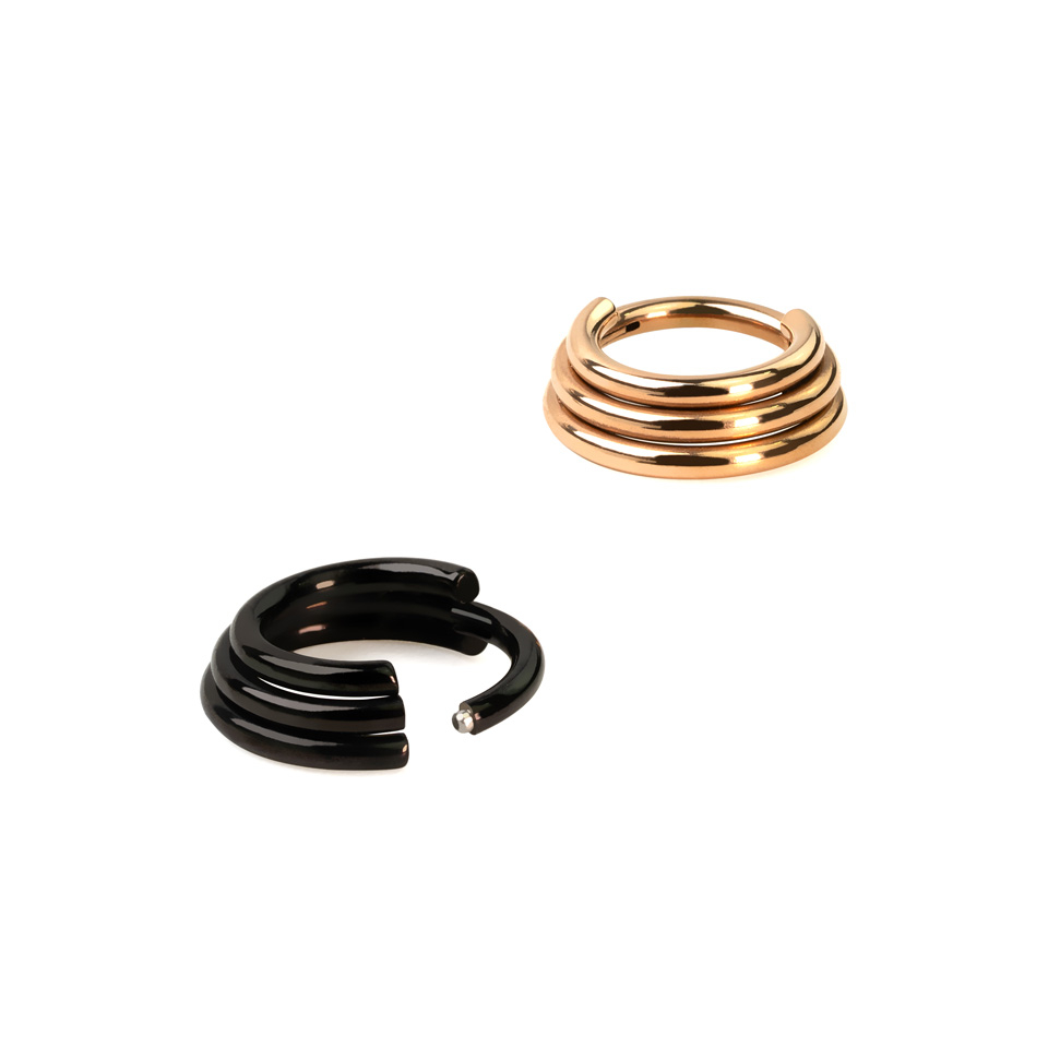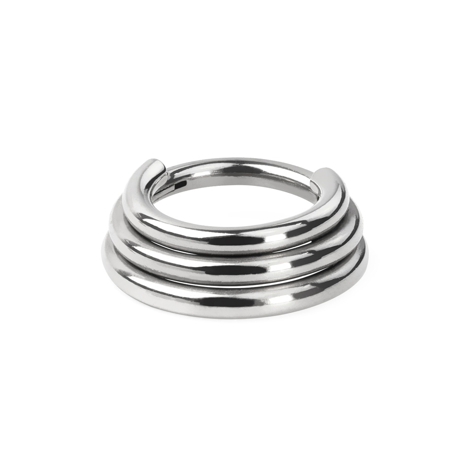 Bien que le nom du bijou soit un triple anneau articulé, il est en fait constitué de trois anneaux individuels soudés ensemble. Seul l'anneau central est en fait un anneau normal. Dans les deux autres, cependant, une partie a été enlevée de sorte qu'une seule d'entre dans ton trou de piercing. Les anneau ont des diamètres différents, mais tous ont le même diamètre de fil de 1,2 mm. Les cercles mesurent environ 7, 8 et 9 mm respectivement. De plus, le bord qui mesure 8 mm a une fermeture à charnière et est donc celui qui doit être inséré dans ton trou de piercing.