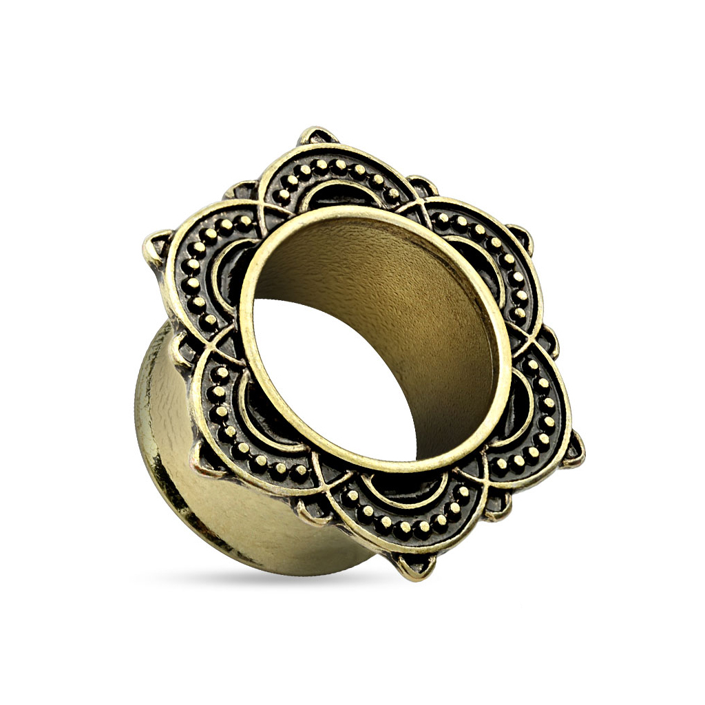 Si tu recherches un tunnel différent des autres et tout à fait unique, ce tunnel t'intéressera sûrement. Ce bijou est en acier chirurgical et a subi un traitement de placage d’or spécial qui donne à cet aspect de l’ancien de l’or. Le bord du devant de ce bijou est orné de la belle rose de Syrie, en laiton.