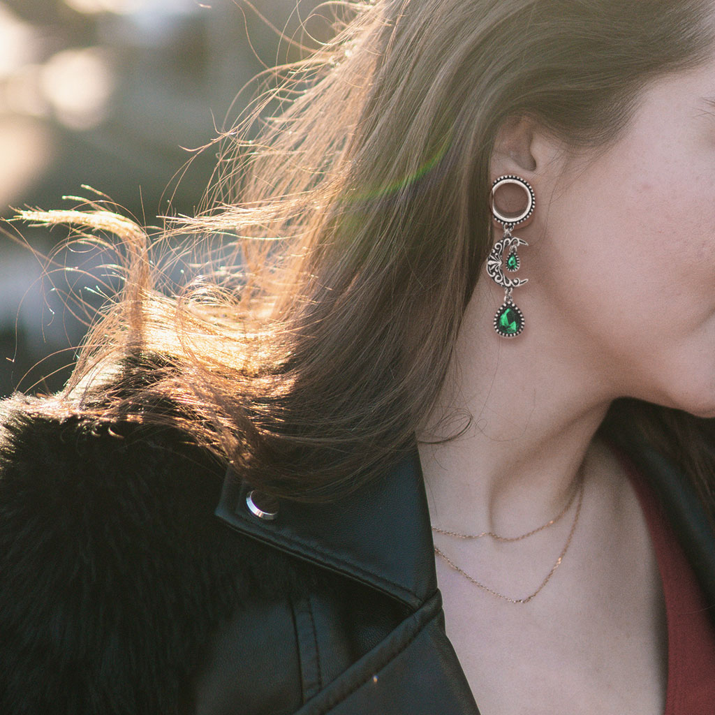 La grande majorité des tunnels est généralement composée d'un seul anneau. Parfois, il y a aussi certains éléments décoratifs. Avec ce modèle, nous avons fait un grand pas en avant et ajouté un pendentif plus long sur les bijoux. Le pendentif se trouve au dessous de l'anneau. L'anneau à insérer dans le trou existe dans plusieurs tailles.