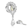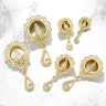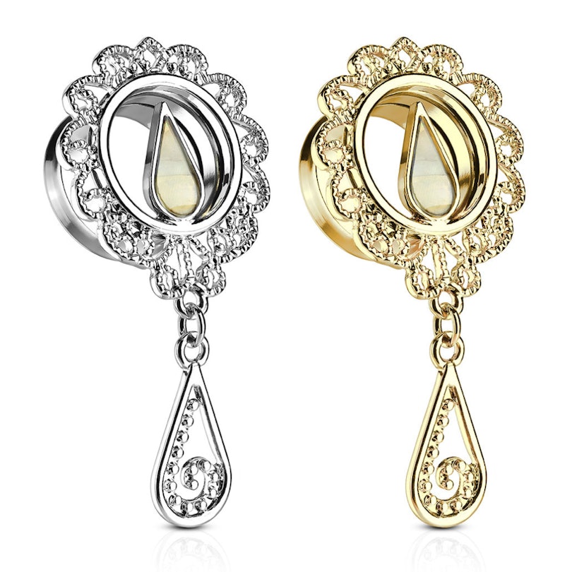 Il y a en fait deux gouttes sur ce bijou. L'une qui pend librement sous le tunnel dans un petit anneau et l'autre coincée à l'intérieur du tunnel, qui a également une nacre incrusté. Autour du tunnel, une guirlande de petits bras bizarres forme un joli motif en filigrane.