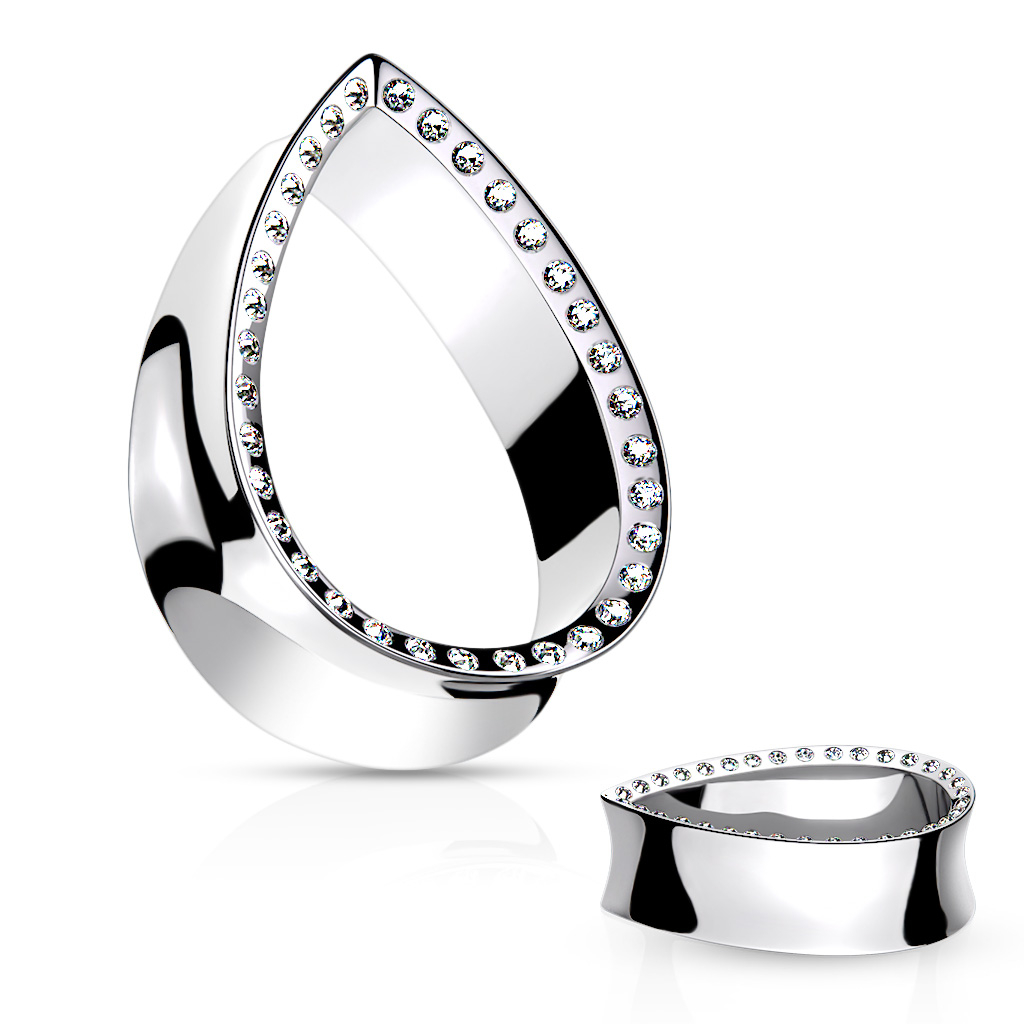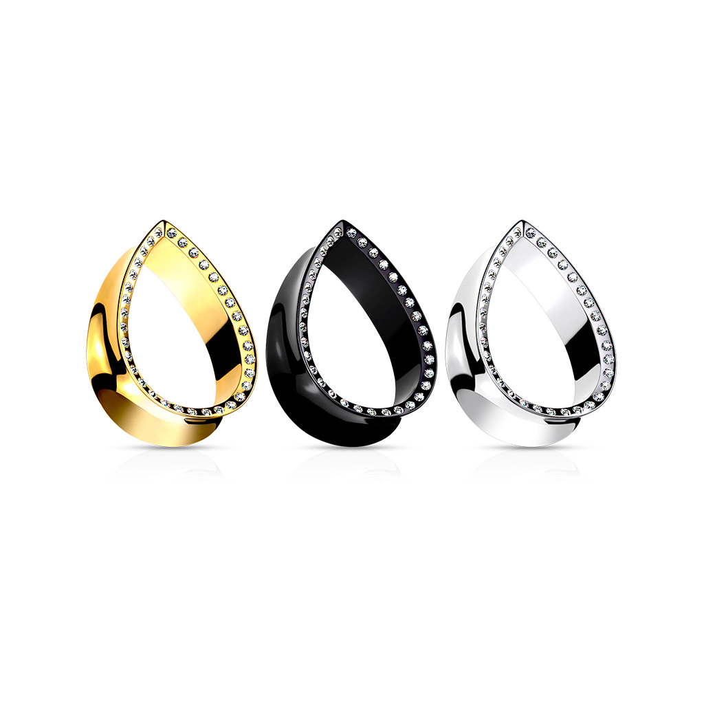 La grande majorité des tunnels sont ronds. Ce tunnel est en forme de goutte - ou de poire. Il est disponible en trois belles couleurs, comme tu peux le voir sur l'image du produit. Toutes les variantes sont bordées de petites pierres. Bien sûr, plus la circonférence du bijou que tu choisis est grande, plus il y aura de pierres sur le bord.