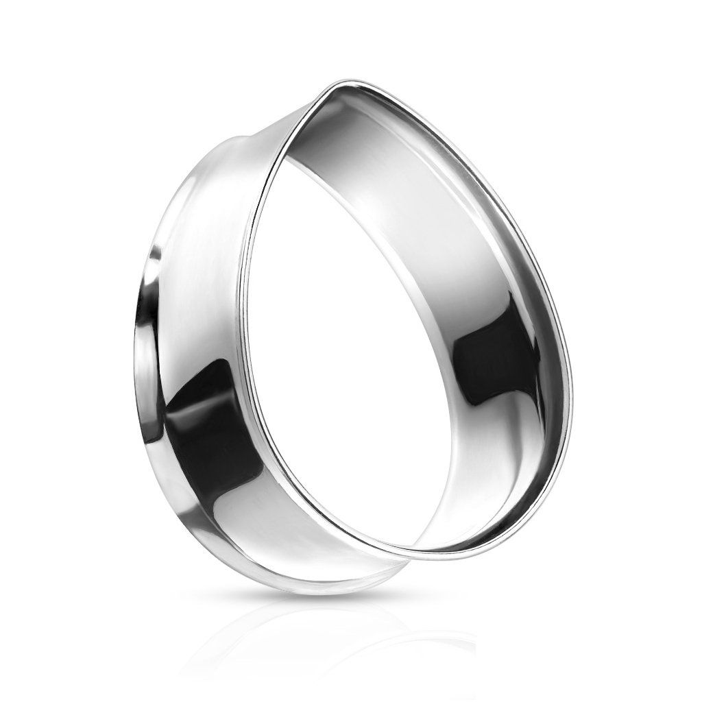 Le tunnel que tu vois ici est en acier chirurgical. L'épaisseur du métal est toute petite. Du coup, les bijoux peuvent paraître plus gros qu'ils ne le sont en réalité. L'épaisseur est d'environ 0,5 mm. Les bijoux sont en forme de goutte ou de poire. On pourrait dire que la goutte est un peu potelée.