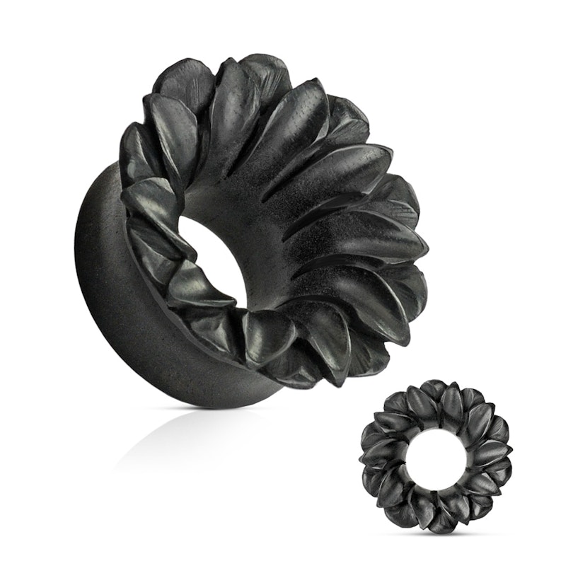 Cette fleur noire en forme de tunnel est faite de bois organique, qui s'adaptera parfaitement à votre corps. Il est sculpté dans la forme d'une fleur de lotus et sera beau dans ton piercing.