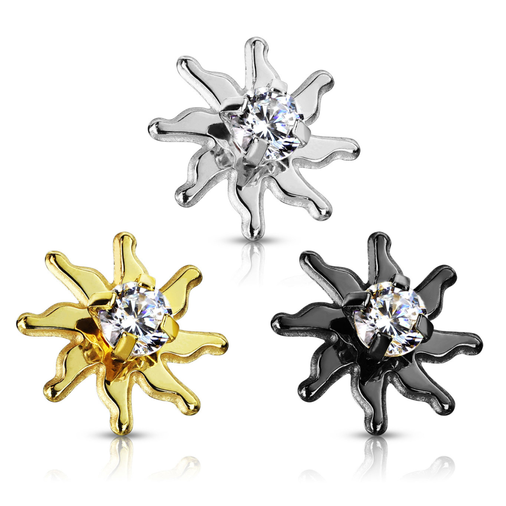 Ce haut peut être utilisé si tu as déjà une ancre dermale sous la peau. La pointe se visse facilement dans une base existante, après quoi tu auras un beau soleil brillant assis sans la peau. Les 8 rayons du soleil sont légèrement cambrés et on sent que le soleil est en mouvement car les rayons sont orientés de la même manière.