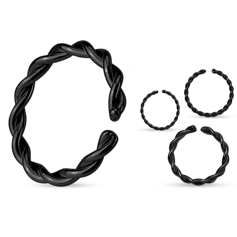 Ce modèle est une version légèrement différente du populaire anneau sans fin. L'anneau sans fin classique se compose d'une seule pièce de métal et les extrémités sont reliées entre elles. Cette version se compose de deux pièces en métal qui ont été torsadées de sorte à obtenir un effet tressé. Les extrémités ont été légèrement soudées puis arrondies, et ce pour deux raisons : faciliter l'insertion du bijou dans ton trou de piercing et garantir une meilleure solidité au bijou et ainsi éviter qu'il ne se casse.
